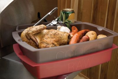 XCH1023: Features: -Marinates, stores, chills and serves food and keeps accessories close at hand-One large tray is clearly marked raw-One large tray is clearly marked cooked-Tool caddy tray hooks to the food tray edge for use, fits inside tray for storage-Use trays to keep chilled food cold while serving-Accessory caddy hooks on side for easy access-Labeling surface on trays allows for marking contents and date with dry-erase pen. Includes: -Includes four essential pieces in the set to keep raw and cooked food separate while cooking.